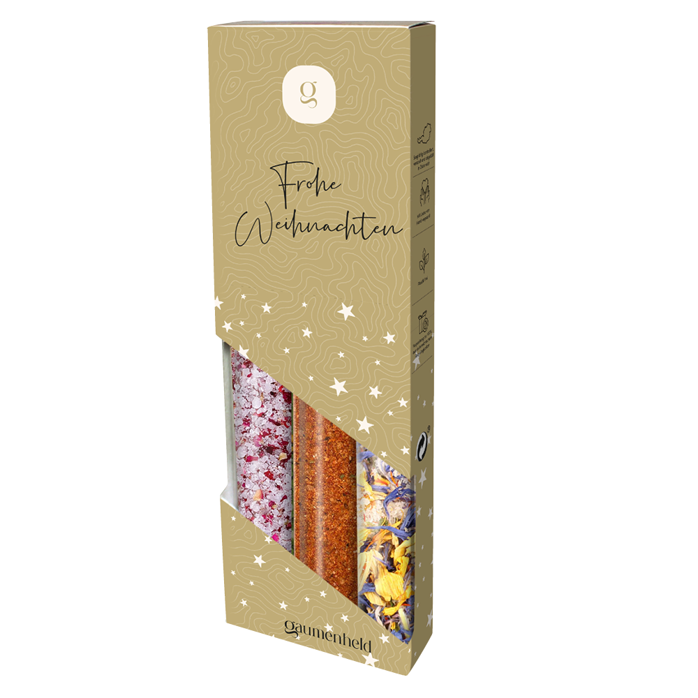 Verschenke mit unserem weihnachtlichen 3er-Gewürzset einen kulinarischen Gruß, an den sich deine Liebsten auch nach den Festtagen täglich in ihrer Küche erinnern.